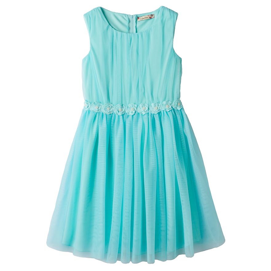 Blooming floral accents embellish the waistline of this delightful girls' dress from Speechless.