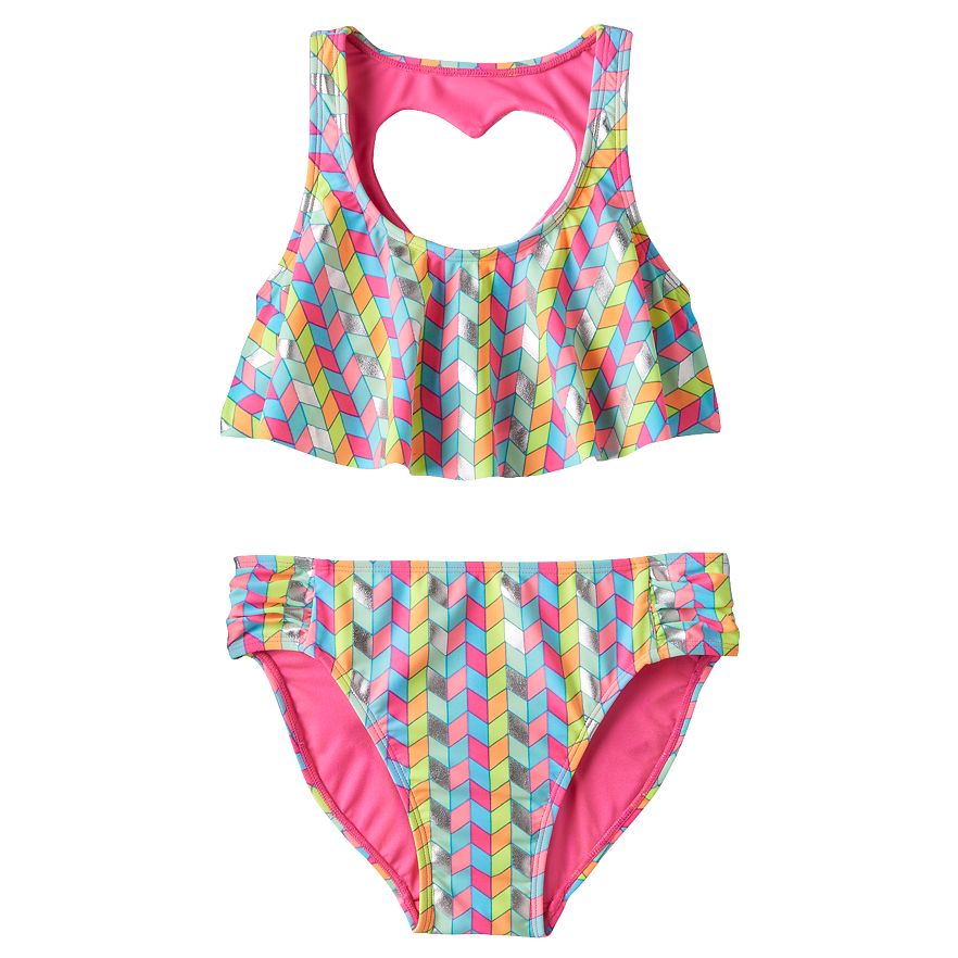 Give her a trendy pool look with this girls' SO chevron-print bikini swimsuit set. In pink/blue/multi.